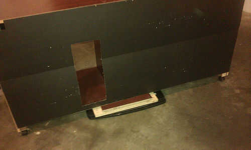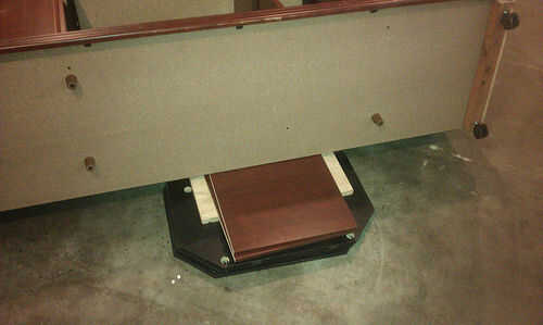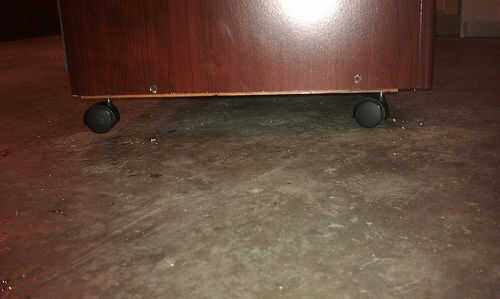 2. Levante el borde de la mesa que está en el piso y deslice en una pila de madera que es más alto que las ruedas.