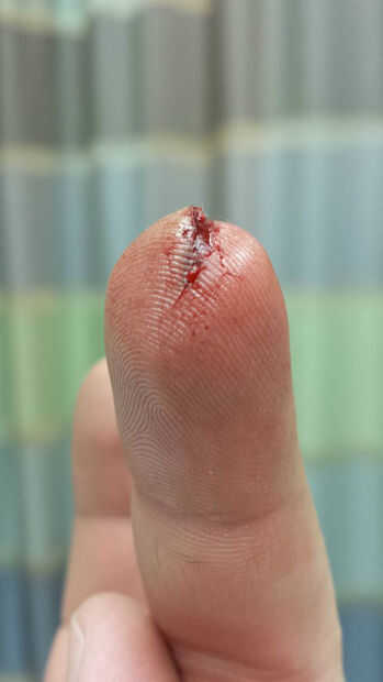 Consegui esto al cambiar la hoja del cepillo queden por segunda vez. Me estaba tratando de correr las cosas y me descuido... 4 puntadas más tarde que estaba detrás en pista. Justo iba a superglue se cerró pero esto estaba hasta los huesos por lo que me alegro cuando en.