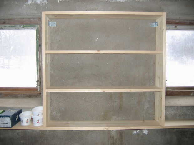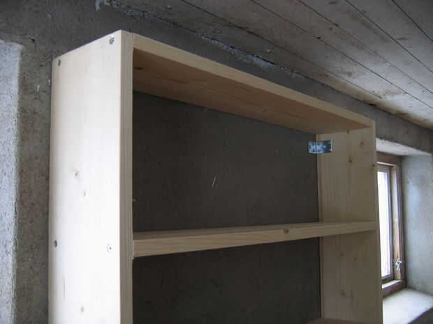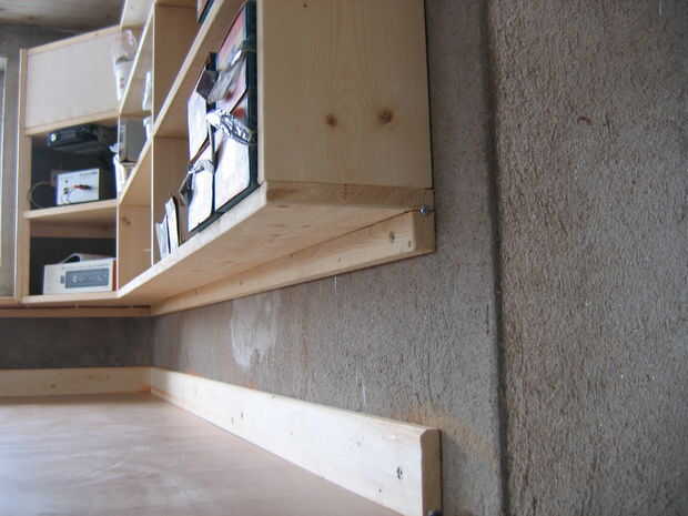 Consejo: Ordinario Compro tablones 21 x 170 mm, les tornillo juntos y ponerlos en las paredes utilizando escuadras. Uso una pequeña cornisa como soporte de peso en la parte inferior.