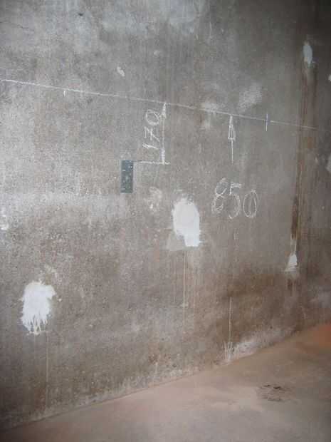 Comience por dibujar una línea nivelada horizontal en las paredes que describe la superficie de trabajo final. (Soy bastante alto y prefiere una altura superficie de trabajo de 850 mm). Ser muy cuidadoso de que la línea es absolutamente horizontal, porque la estructura entera se basarán en esta línea. Utilice un nivel largo o un láser de línea. Comprobar la posición de la línea.