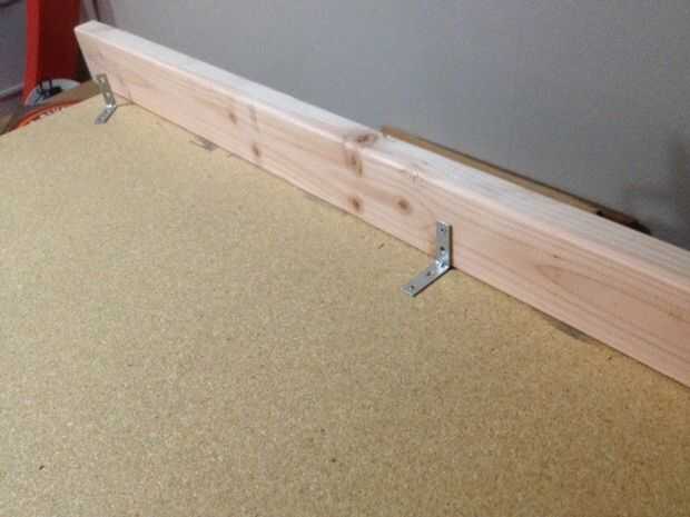 A continuación, volcó la encimera y agregó uno de los 2 x 4 al borde que se fije a la pared. Aseguró el perno con varios tornillos de 3" desde el lado de corte de la encimera en el perno y seis de 2 x 2 abrazaderas de las esquinas en el lado de la mesa de trabajo con tornillos de 1/2". Si te hace sentir mejor, usted puede utilizar más, pero creo que esto debería aguantar bien. Esto apuntala el tablero de partícula mucho más.