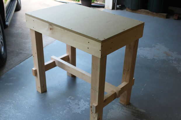 Se trata de una simple Mesita Plegable mesa de trabajo y montaje que hice. Las dimensiones pueden parecer extrañas pero era tan grande como podía conseguirla mientras todavía montaje debajo de mi uno actual. También es lo suficientemente alto para que la superficie de la mitre vio cuando está a nivel con mi banco de trabajo grande, es lo que permite mi para facilitar cortar tablas largas. Esto fácilmente puede ser adaptado para ser un banco de trabajo sólido y permanente con sólo unos tornillos adicionales.
