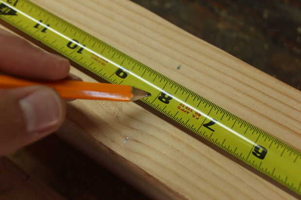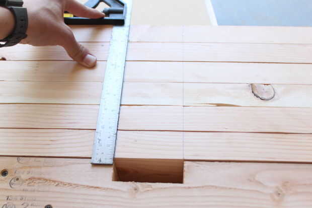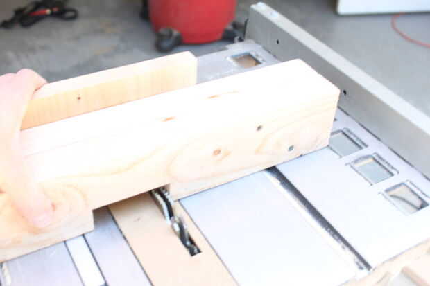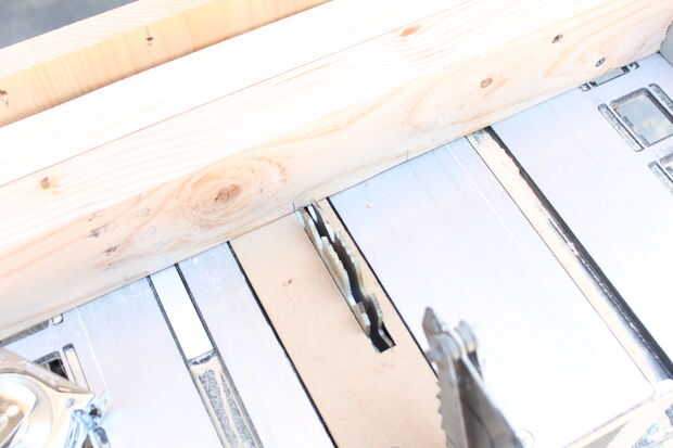 Mida 8" desde la parte inferior de cada pierna, luego colocar una camilla en la parte inferior en 8". La marca. Esto será cortado mediante una combinación de calibre de ingletes y rip valla. Coloque el tope lateral para que cuando la pierna está contra él, tocarán la lejana línea que marcó. Corte, luego deslice la pierna a la otra línea y corte. Luego cortar el entre bits. Usar para otras patas de la base. Para ello en los cuatro.