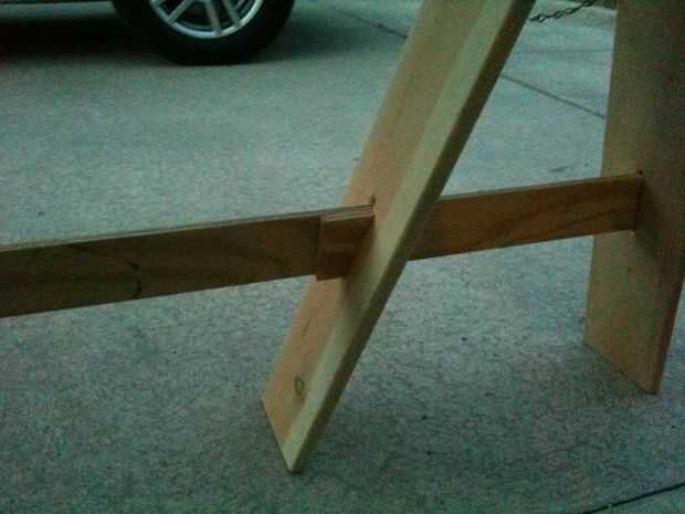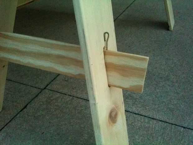 Dos imágenes demostradas mi idea de prototipo de encerrarlos juntos, en fin era un pedazo de madera contrachapada cortan inglete de ° 15 para que coincida con el ángulo de la pierna, pegados y clavados. El otro extremo era una pequeña pieza de suspensión de paño doblado en una forma de alfiler de gancho de ojo, cayó en un agujero perforado verticalmente sobre la camilla. Si en caso perdí el pasador (es), no es gran cosa, sólo hacen uso un clavo o una otra.