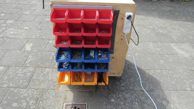 Esta es mi estación de trabajo portátil para edificio de electrónica pequeña manía. Voy a incluir una fuente de alimentación de voltio 12 de baterías SLA, un Dremel(knockoff), para soldar hierro, batería recargable, toma de encendedor de cigarrillos,