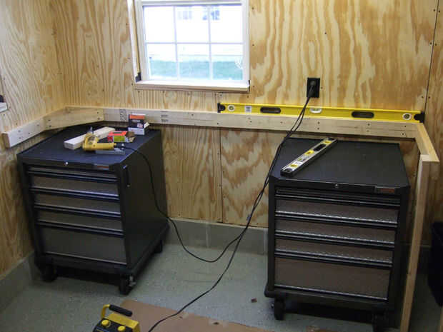 En el ejemplo presentado, voy a mostrar el proceso para construir un banco de trabajo en la esquina de un garaje de madera enmarcado. El primer paso es localizar los postes de madera. Usar un studfinder o de lo contrario identificar visualmente los sujetadores para localizar a los miembros de la estructura. Luego decida cuál es la altura de su mesa de trabajo. Asegúrese de considerar el espesor de la mesa (1" en este caso). Puse mi borde inferior de workbench en el 36" para que mis cajas de herramientas rodantes podrían caber debajo de él. Eso significaba que era la altura de trabajo superior final aproximadamente 40,5" que es una buena altura conveniente para mí. Dependiendo de su altura y otras consideraciones se puede regular la altura por consiguiente.