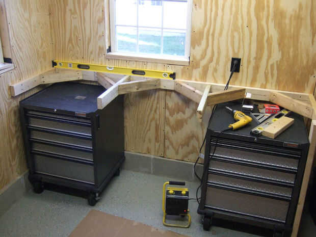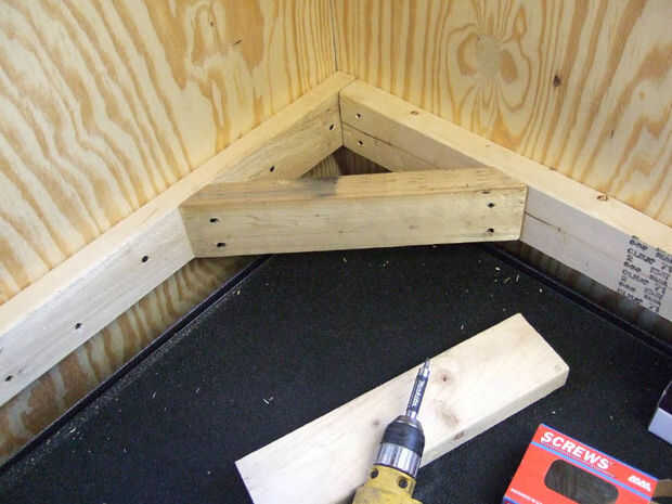 Ya que mi banco es de alrededor de 8' de largo, he añadido dos soportes transversales conectarse anclado detrás del Banco de la parte delantera. Debe apoyar su banco sobre cada 24" a 36". Para ello, corte algunos 2x4s chatarra a la profundidad de su banco, menos la 3" para el frente y hacia atrás 2 x 4 espesores. Así que ya que mi banco es de 27" de profundidad, que necesitaba cortar trozos de 2 x 4 a 24". Use un clavo oblicuo a la posterior 2 x 4 y cortar algunas diagonales más. Usted querrá triangular cada plaza que haces en tu banco. Ya que he añadido dos más traviesas, suéltelas y así tenían 3 plazas, necesitaba 12 diagonales total. Desde que ya instalamos 2, sólo necesitaba hacer 10 más. Ver fotos a continuación para obtener más detalles. Con los soportes transversales instalados, triangularles la espalda 2 x 4 como en la imagen.
