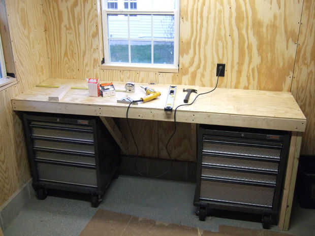 Con el cuadro del banco completo y anclado a la pared por los lados y algunos soportes diagonales verticales, la próxima cosa a hacer es colocar la parte superior. Había utilizado dos capas para mi mesa. La capa inferior se hace de 1/2 trozo de madera contrachapada gruesa que es estructuralmente muy fuerte. Sin embargo, las fibras de madera en madera contrachapada y madera dimensional regular comprimirá y abolladura bajo asalto de martillo y otros servicio de banco de trabajo duro. Productos de la fibra como aglomerado, OSB (tablero orientado del filamento) y MDF (fibra de densidad media) pueden manejar martillar mucho mejor aunque no sean tan estructuralmente fuertes en muchos casos. El primer paso es cortar y atornillar una capa de madera contrachapada o cualquier hoja de scrap de stock te tener a mano. Utilice tornillos de 1 5/8" o similares. Ver foto. Traté de hacer la capa de madera contrachapada para cada diagonal y apoyo debajo con al menos dos tornillos por cada miembro cruzado. Por este marco de boxeo bien añades mucha fuerza a la mesa de trabajo.