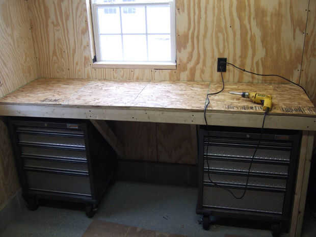 Una vez tiene la primera capa, colocar la capa de "castigo". Como comentamos, usé OSB tuve pieza adicional colocación alrededor y porque puede manejar el abuso. También, en caso de que usted necesita reemplazar la parte superior más adelante, puede tira el OSB barato y agregar más u otro material de su elección. Ya que esta superficie es la capa de sacrificio, utilizado unos tornillos para que sea fácil de quitar si alguna vez consiguió demasiado ratty. Ver foto.