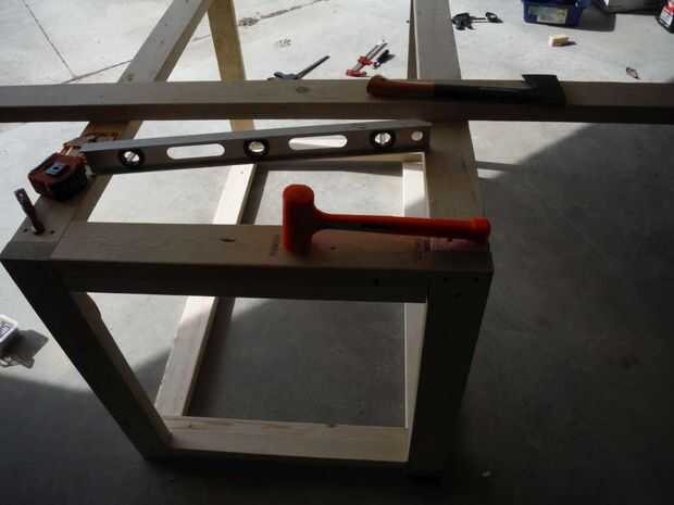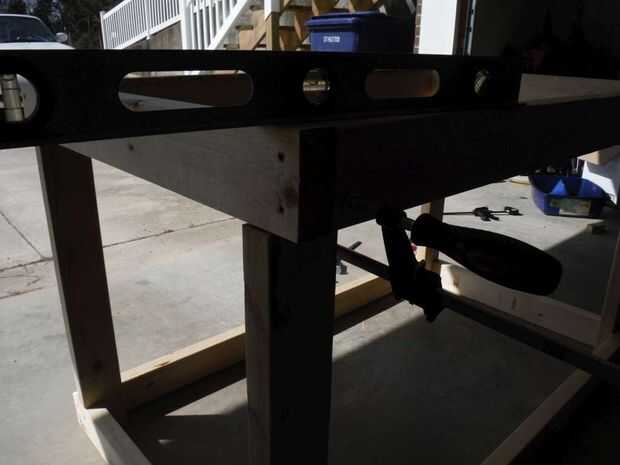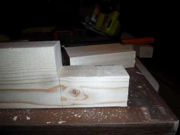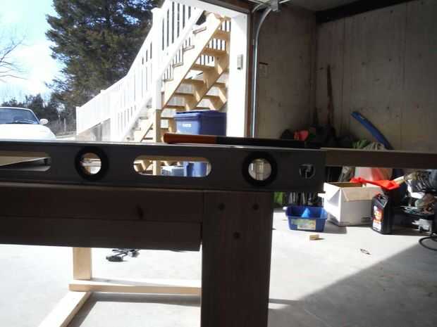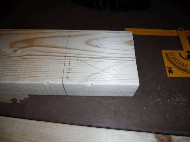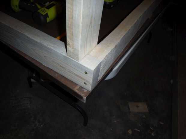 Sujeta las 4 patas juntas y marcado por el borde corto 3 ½" luego hizo un 1 ½" profundo cruzado corte en todos los tableros de 4 luego que hasta terminó los postes y otro corte transversal para empezar a los 3 ½" que luego terminé a mano. Estos cortes salió algo así como usted pueden ver por las imágenes. Había retocado con la lijadora con abrazadera y los atornilla en cada esquina después de nivelar y escuadrar las piernas. Usé 2 tornillos en la parte delantera y 1 tornillo en el lado.