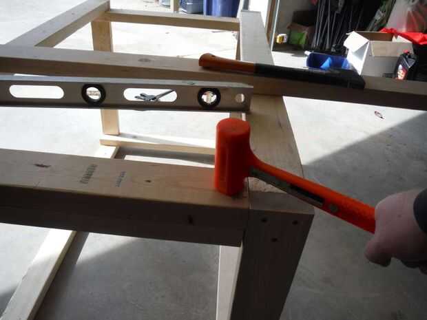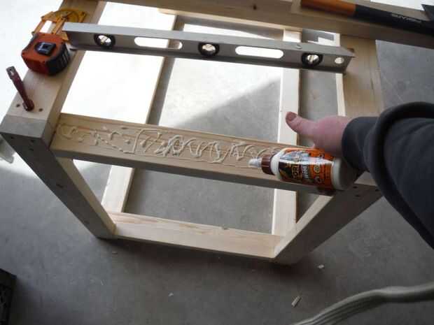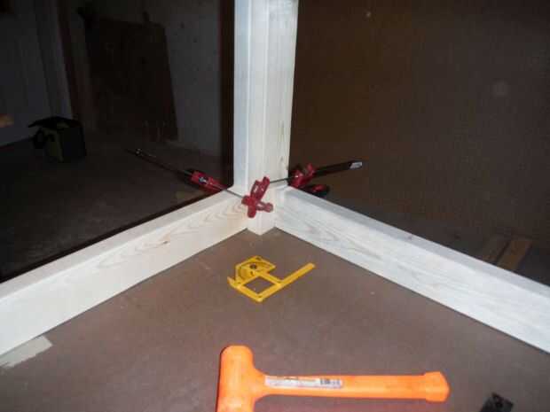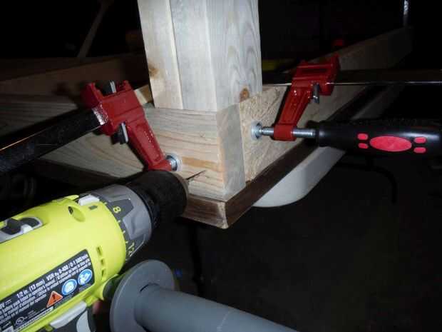 Después de instala la parte interna de las piernas doble comprobar colocación de las secciones 23" lijado para asegurar un ajuste apretado. Apliqué una cantidad abundante de cola a la pierna interior. Con un mazo de golpe muerto sentado la pieza externa de la pierna en su lugar de fijación y atornillado. Después de los 4 tornillos se insertan he quitado mis pinzas y fue hacia la próxima etapa.
