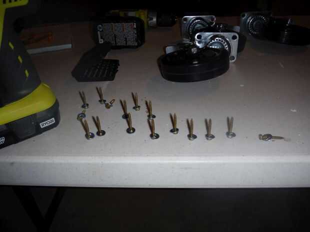 Las ruedas que he instalado con 4-1½" tornillos por rueda manejé los tornillos sin orificios formando un ligero ángulo hacia el centro. Por desgracia mis ruedas no llegó hasta después de que compré mi tornillos. La cabeza del tornillo de la herida por ser demasiado pequeño para los agujeros de montaje. He cavado alrededor en mi cubo tornillo y encontrado varias arandelas #10 que pude utilizar para asegurar las ruedas en la parte inferior del marco.