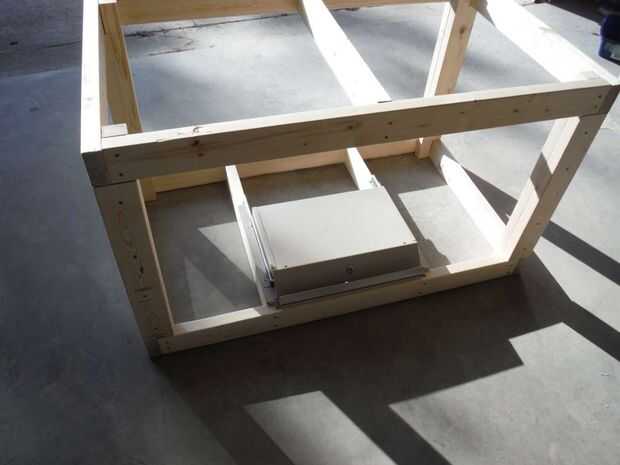 medir el ancho de su mina de cajón resultada para ser de 20 pulgadas entre centros de tornillo. Entonces encontré la línea central de mi banco y mide 10 pulgadas a cada lado antes de mi top de sujeción soporta en su lugar. Después de sujeción aseguró que los orificios de montaje de cajón estaban alineados adecuadamente y sujetan cada pieza a la parte superior del marco con empalmes de tope y tornillos. El soporte inferior se instaló en la parte inferior centro.