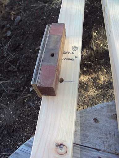 A continuación quería las varillas roscadas 18" aparte y un pie de los extremos así que medido y marcado el 22 que quería utilizar para la parte superior (en aquel momento también decidí que sería la parte superior y sacó una flecha en cada extremo). Ya que quería que la parte superior de plano que hice un bruto medición / cuadratura herramienta así los agujeros sería aproximadamente vertical y centrado. Ver foto, cuadrado taladro para arriba con la cara vertical.