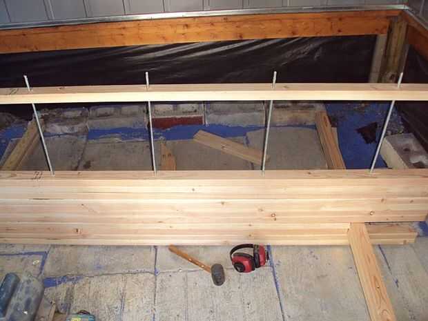 tenía muy poco espacio donde me pone el Banco y, no queriendo cortar lejos cualquier potencial superficie de trabajo, construí en su lugar a su lado lista para ser levantada en posición. Primero rosca una arandela y una tuerca en el extremo de la varilla roscado que se convertiría en el frente del Banco. Entonces empecé a trabajar el 2 x 3 en todas las barras 5 al mismo tiempo, golpeando de abajo firmemente con un martillo de goma. Me di cuenta que había tanta fricción sobre las varillas roscadas que esto era muy importante, si no fuesen ajustados ahora probablemente no podía haber fijo que más tarde. Ésta fue la etapa que me di cuenta de cuán importante eran las orejeras, hay un montón de ruido golpeando lejos dentro de mi vertiente poco metal.
