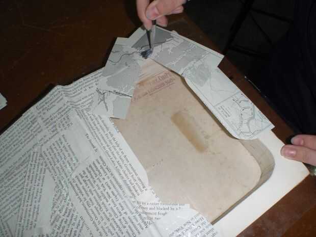 Mediante el uso de despoja de las páginas del libro, pegamento (30% de agua) al interior de la tapa y el libro para conectarlos. Las tiras se podrían poner al azar o en un orden simétrico.