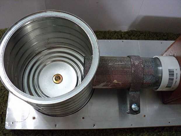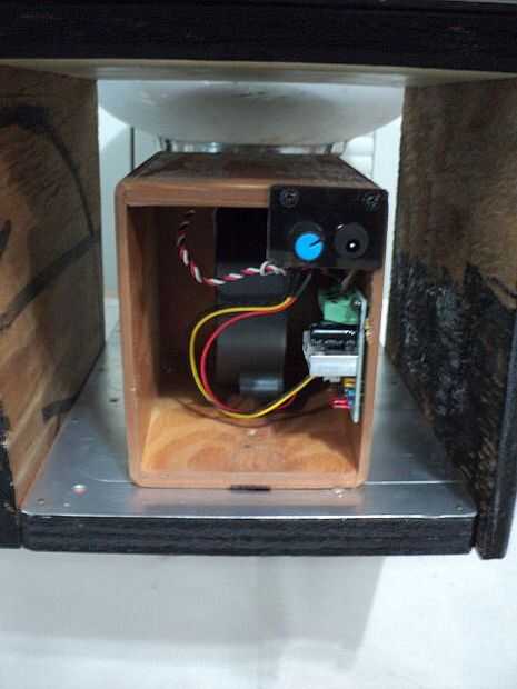 Alambré hasta un control de velocidad de modulador de anchura de pulso de 12 voltios DC sin escobillas ventilador centrífugo motor rescatado de un televisor de proyección. Esto le dio un tiro bueno, controlable, y también hice una boquilla de transición para pasar de tubo redondo a salida de ventilador cuadrado. Finalmente, encuentra todo en una simple caja y había montado a la base de metal revestida.
