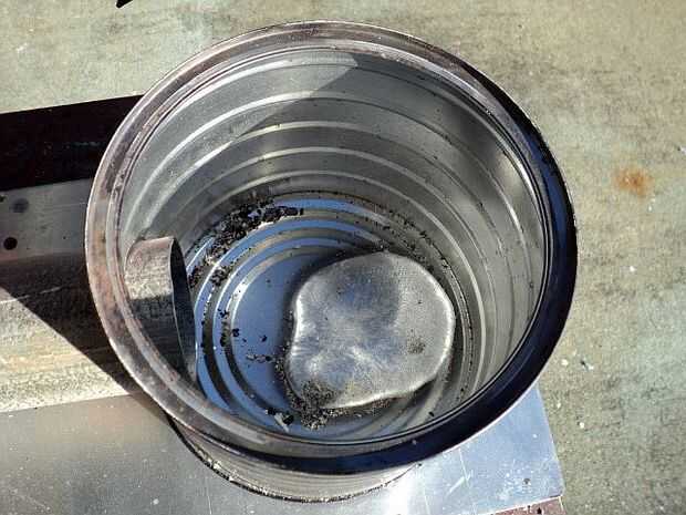 El potencial real de daños ocurre durante una falla de crisol y mi $3 thrift store cacerola tenía uno. Tengo que decir, que después de 8 o 10 se derrite, me debía nada y que terminó con cerca de 15 libras de lingotes clarificadas antes de expirara. Tomó la forma de filtración a través de dos agujeros (círculo rojo) y goteó en el pleno, a través de los orificios de la tobera. Después de refrescar abajo, el bloqueo era despejó e incluso el blob en la base del pleno fue enviado a la pila de aclarado, así que no se había pérdida real de cualquier consecuencia. La ceniza se ver por cierto, es típico después de una sesión, no mucho en todo y un soplo breve de aire limpia hacia fuera, para apunte a un diseño muy eficiente.