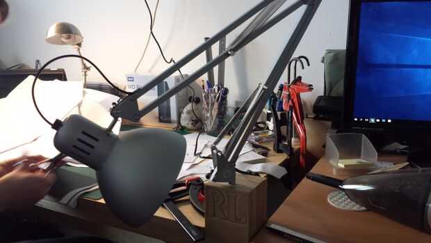 La mortaja de una de las dos patas sueltas está lleno de unos 90 mm de carrera sobra. En esta pieza es perforar un orificio para que la lámpara de Ikea terciarias pueden montarse en esa posición. Otro de estos trazos sobrantes se añadirá a la otra pierna suelta. De esta forma que yo puedo colocar una lámpara en múltiples posiciones en la tabla. El pedazo se atornilla por el revés para que tornillos que no son visibles en las iniciales talladas. También estoy pensando en hackear el soporte de la lámpara por lo que puedo montar mi cámara en él o mi novia puede montar su micrófono en él. De esta manera la tabla se convierte más y más modular como previsto.