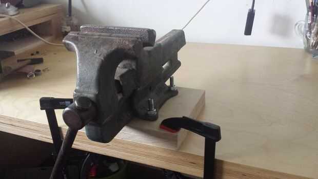 No quiero tener mi tornillo montado a mi banco todo el tiempo. Así que utilizando piezas de madera de desecho que queda de mi banco hice una placa que pienso montar mi tornillo de banco. La placa se puede fijar a la mesa de trabajo con abrazaderas, proporcionando un agarre sólido.