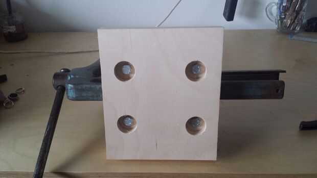 La placa consiste de dos piezas de madera contrachapada pegadas. En la capa inferior haya perforado los agujeros que pueden albergar las cabezas de los pernos. Agujeros en la capa superior sujeta el tornillo a la placa.