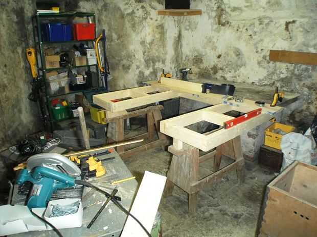 Porque mi piso es de piedra áspera losas puestas directamente sobre desnudo de tierra es un poco irregular, así que en lugar de cortar una carga de las piernas de la misma longitud, medido cada ubicación y acumulado a la estructura.
