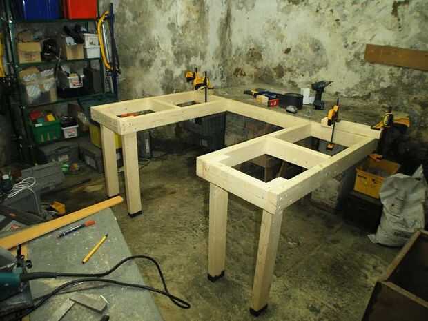 Primero construí la estructura que soportará la parte superior, luego puso esto sobre caballetes y fijada a la losa de piedra. Un poco de trasteando con el nivel de burbuja para obtener planos y estaba listo para comenzar en algunas piernas.