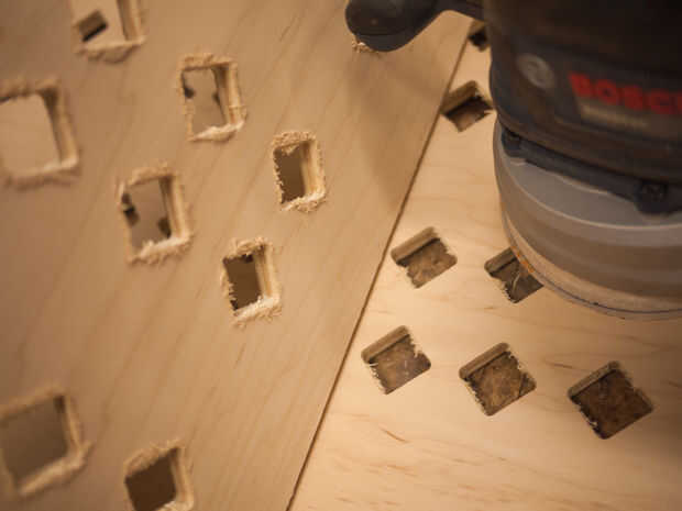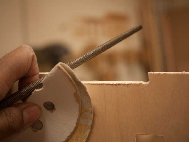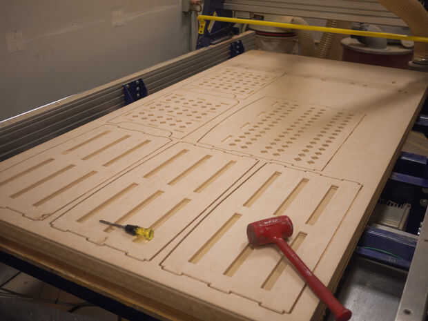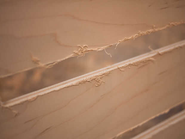 Como se puede ver, cada parte tenía pelusa significativa en la parte inferior, especialmente alrededor de los orificios de ventilación. Esto fue el efecto de la broca de downcut que hablé anteriormente. Este parpadeo tomó un poco de tiempo para limpiar con papel de lija y los archivos de la mano, pero no fue tan mal porque el corte no dañar ninguna de las piezas acabadas por astillar la madera, apenas dejó material extra.
