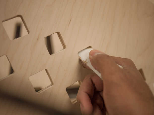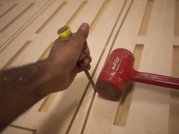 Después de todas las partes fueron cortadas, solía un mazo cincel y goma para romper cada uno de ellos con las pestañas. Luego pela el resto del material de la mesa y limpiar la máquina.