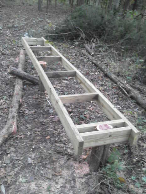 he utilizado madera de 2 "x 6" Tratado para construir el marco. Entonces el Banco es 18" ancho (profundidad), porque... He comprado 16' juntas. Así que corte 13' 16' cada tablero, entonces yo cortar 2-18" tablas de cada tablero de 16'. Hay mi marco básico. Utilicé tornillos de 3" en el tirafondo de marco y 1/4" x 5" para sujetar a cada tocón (2 en cada tocón). Luego añadí algún desecho de 2 "x 4" como soporte para las placas cubiertas. Usé 2 x 4 porque tenía piezas adicionales.