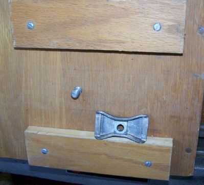 os adjunto dos grapas a la parte inferior de la tabla. Estas queden firmemente contra los lados frontales y posterior de la cama del torno para mantener la tabla alineada con la hoja de sierra. Habrá más sobre eso más adelante. Observe el perno del soporte del torno y el racor con tuerca para bloquear la mesa sobre la bancada. También viene del soporte de la herramienta. Los tacos deben ser ajustables para mantener la tabla en la alineación con la hoja de sierra.