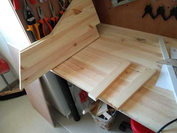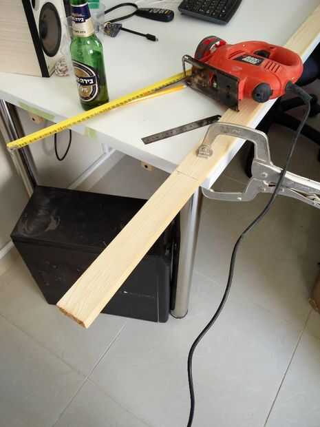 Así cortar con una sierra 5 pedazos de varillas de pino bosques y atado a la madera con tornillos