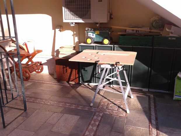 Algunas herramientas simples, 4 paletas madera y un banco de trabajo plegable con una superficie plana contribuyeron en esta marca de muebles al aire libre.