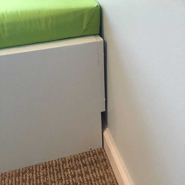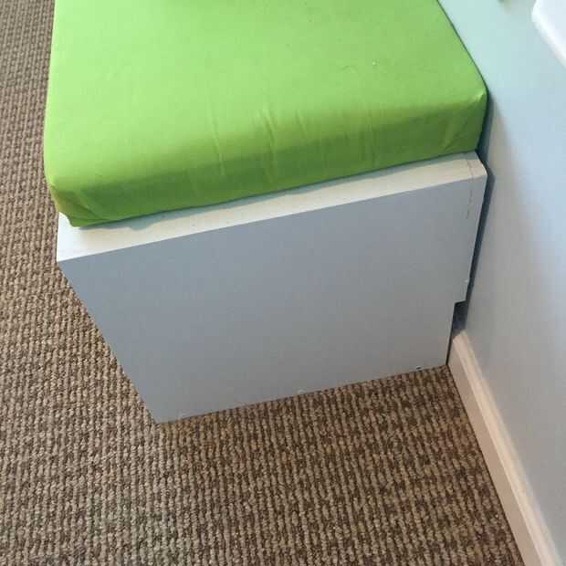 No sé que hubiéramos podido hacer esto sin algún tipo de estrategia de sujeción. Al final del proyecto, habíamos roto 2 Irwin liviano abrazaderas de esquina (son basura). Mientras que resultó, el espaciador de chatarra y un cuadrado de la velocidad eran suficientes cuando se utiliza con unas abrazaderas de apriete. La última pieza para añadir a la estructura era la pieza de longitud completa que habíamos arrancado en aproximadamente la mitad - 8". 1/2" pasó a ser el grueso de nuestros zócalos, por lo que esta atornillado a la parte posterior de cada banco mantiene a la compensación de la pared y guardado allí de ser un espacio detrás del Banco.