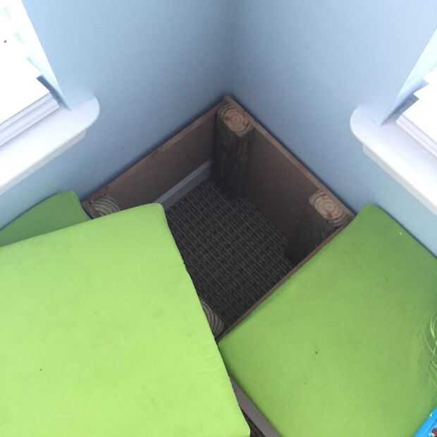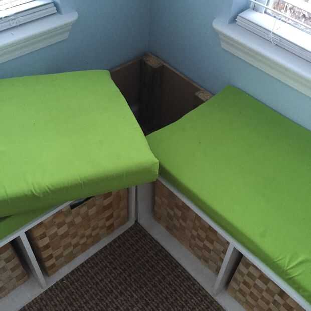 De la esquina, corta secciones de una pieza de 4 x 4 de desecho para hacer 4 puestos y atornillar los paneles alrededor de ellas para hacer una caja solo un pelo de 16.5, cuadrados. Esto mantuvo la sección de esquina dentro de la profundidad de los dos bancos. La altura de los paneles/barras verticales de la esquina fue fijada a 13,5 para que un panel de 1/2" descansaría nivel con los bancos. Aquí el grupo se redujo de chatarra.