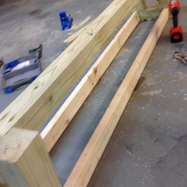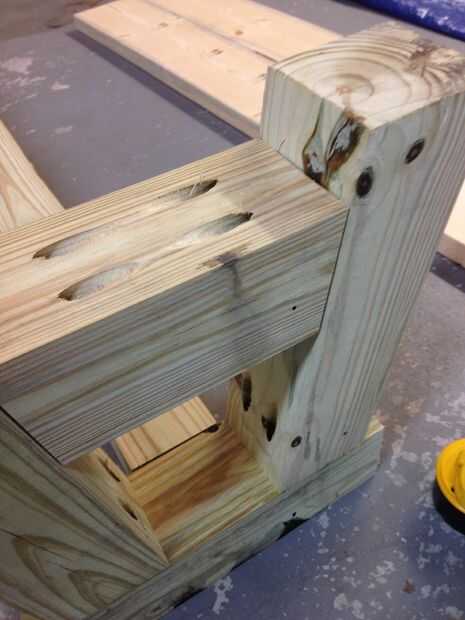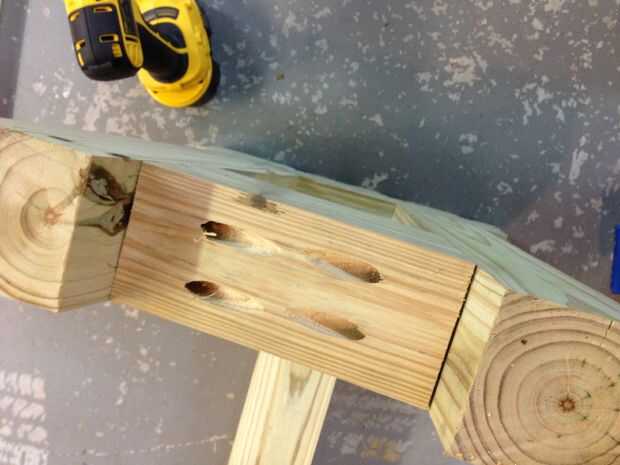 Para conectar la viga centro 4 x 4, usted puede apuntalarlo a una altura para que se alinee con el centro de los soportes laterales. Fui con la opción más perezoso de solo colocar la viga en el panel lateral y enroscarla en.