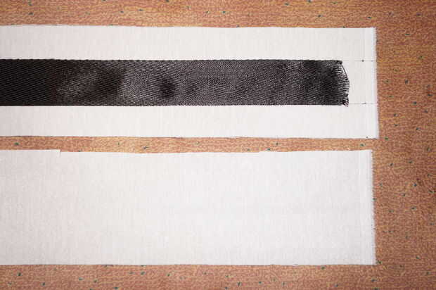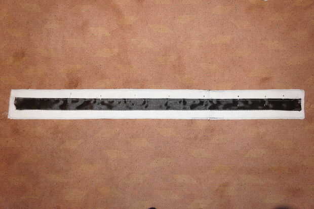 Parte superior se cosió con la restante cuarta tira de tela. El resultado será un sándwich: tres capas de tela, cinta de carbón + una capa de tela. El significado de esto es que puedo poner la correa por un lado, si tengo frío o la otra, si no muy frío.