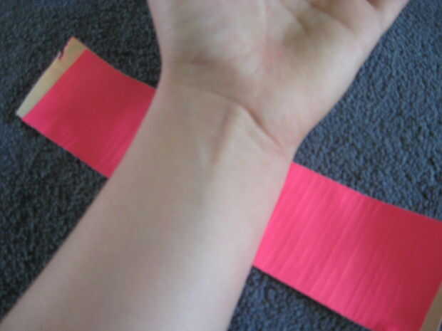 Poner en poner hacia abajo y coloca tu brazo en él. Entonces traer un extremo y lo puso en su muñeca [Asegúrese de no se pegue a la piel]. Traer el otro lado y atttach que el uno alreaady en la muñeca.