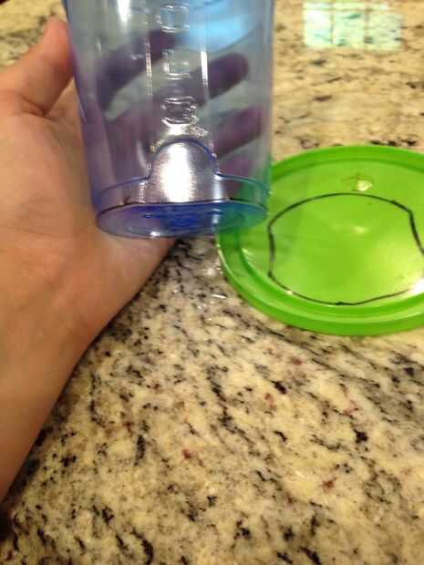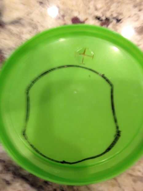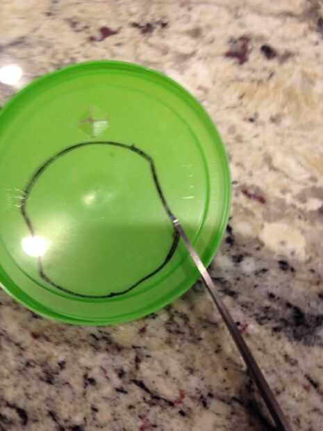 Primero que desea colocar la taza en la tapa como tal. Luego trace una línea con el rotulador en la parte inferior de la taza en la tapa. Luego corte todas la tapa fuera de la línea negra.
