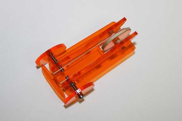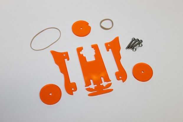 No es el coche de la última banda de goma, pero muestra el principio. La goma de la bobina se limita a un par de vueltas de la rueda trasera o se atranca. En realidad, mi experiencia lo mejor es colocar un trozo de cuerda a la goma y viento que en el eje, pero quería cumplir el material que elijo para mi corte serie calendario de Adviento: hoja de acrílico de 3mm, bandas de goma, M3 x 20 mm tornillos y tuercas M3.