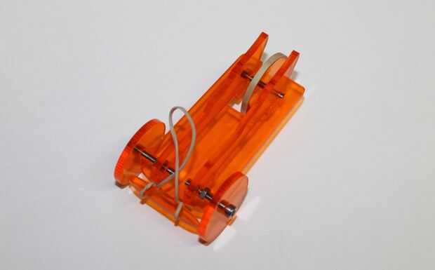 Es un pequeño vehículo de juguete con ruedas tres, propulsada por una goma.