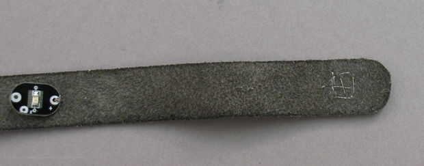 Coser algunas puntadas a través del orificio más en la mimeolight, y luego trabajar hacia un extremo de la correa. Terminar con varias puntadas ancho en la punta para formar el plus de su "soporte de batería". Un nudo y corte.
