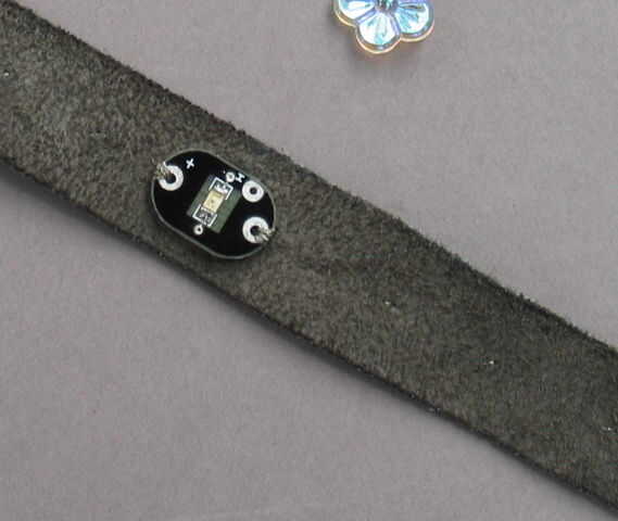 Con una nueva sección del hilo, hacer varias puntadas a través del agujero menos de la mimeolight y entonces trabajar hacia el otro extremo de la correa. Tenga en cuenta que desde el plus de su soporte de la batería terminada en el lado rugoso, ahora debe acabar por el contrario, lisa lateral.