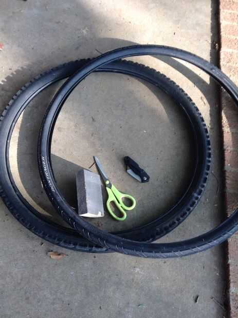 fácil de hacer la alfombra usando tubos de neumáticos de bicicleta!Paso 1: Reúna sus materiales Se necesita:- Tijeras o un x-acto (yo usé tijeras dentadas porque hace cortes regulares mucho más lindo!)- Tubos de bicicleta descartados (empecé con 9, p