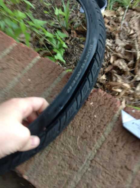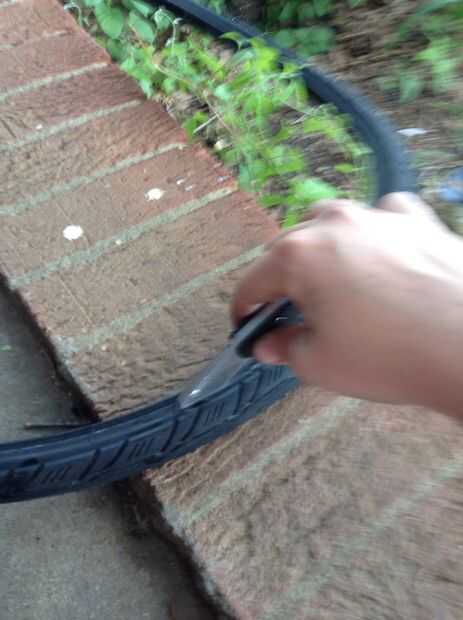 para cortar el neumático que perfora a través de la pared lateral del neumático con mi cuchillo, así que tenía una raja que quepa una tijera par, cortar el resto de la pared lateral, repetí esto en el otro lado de la llanta para que ambos laterales fueron cortadas.