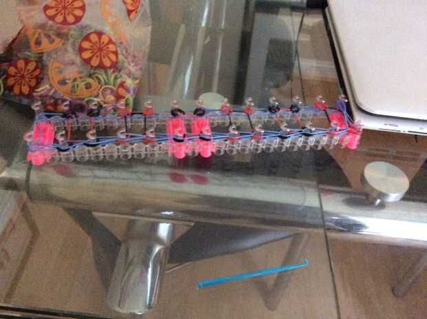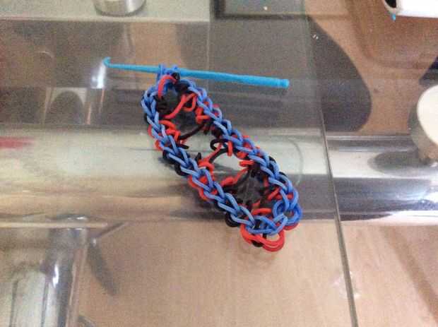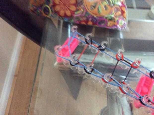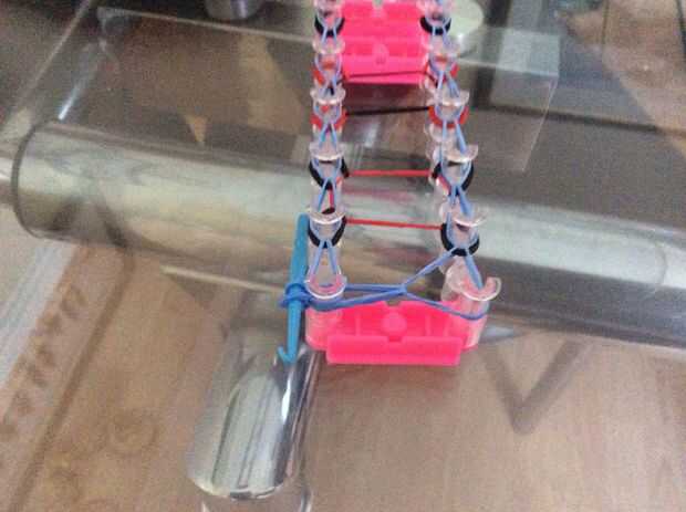 esto es un braclet muy fácil y divertido para hacer. Esperamos que disfrutes!Paso 1: materiales Se necesita: un telar, gancho, elásticos y un clip de C.Paso 2: Colocar los elásticos Primero escoger tres colores y a la clavija central. Sacó su color e