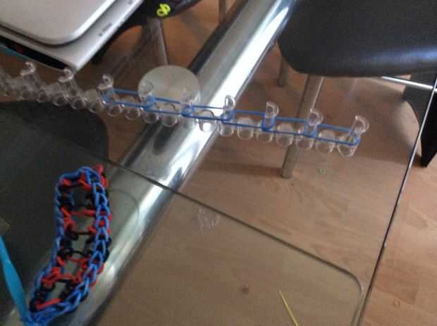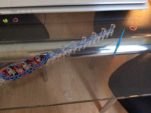 esto es un braclet muy fácil y divertido para hacer. Esperamos que disfrutes!Paso 1: materiales Se necesita: un telar, gancho, elásticos y un clip de C.Paso 2: Colocar los elásticos Primero escoger tres colores y a la clavija central. Sacó su color e