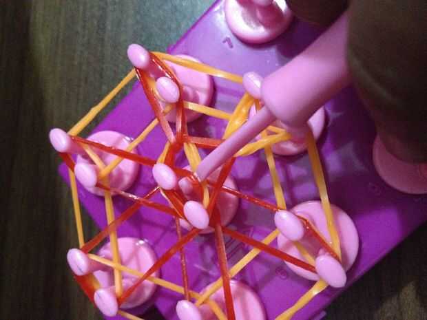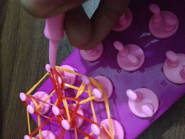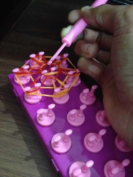 1: empezar a girar el telar para que la flecha caras you.from debajo de la banda de la tapa tome la primer banda roja (Foto 1) y lazo en el centro de la starburst. Foto 2