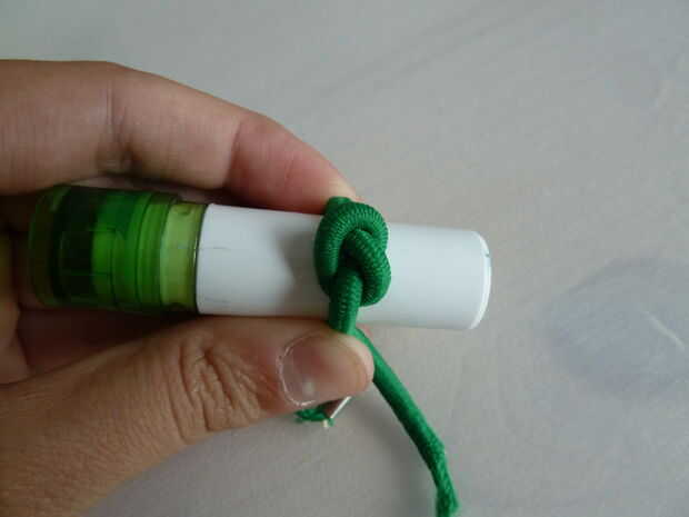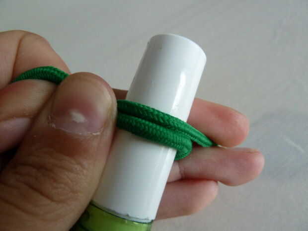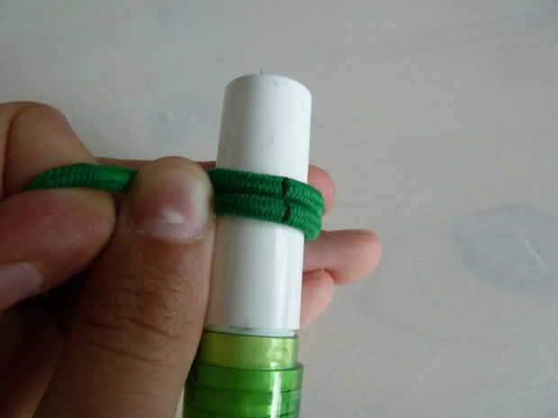 Tomar su objeto redondo y colocar el nudo en ella. Envolver ambos lados alrededor de ella un poco ajustado, mientras sujeta el nudo por lo que mantiene su tamaño. Tomar el marcador y dibujar una línea como se muestra, para saber donde cortar la banda. Este fue el momento que descubrí que mi marcador azul estaba vacía, así que terminé usando uno negro.