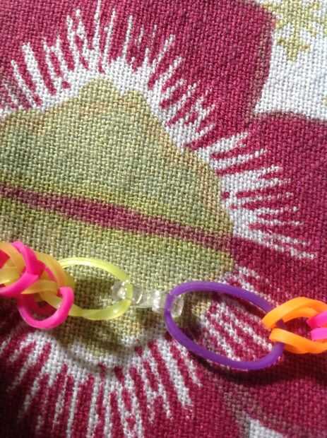 esto es un braclet muy fácil y divertido para hacer. Esperamos que disfrutes!Paso 1: materiales Se necesita: un telar, gancho, elásticos y un clip de C.Paso 2: Colocar los elásticos Primero escoger tres colores y a la clavija central. Sacó su color e